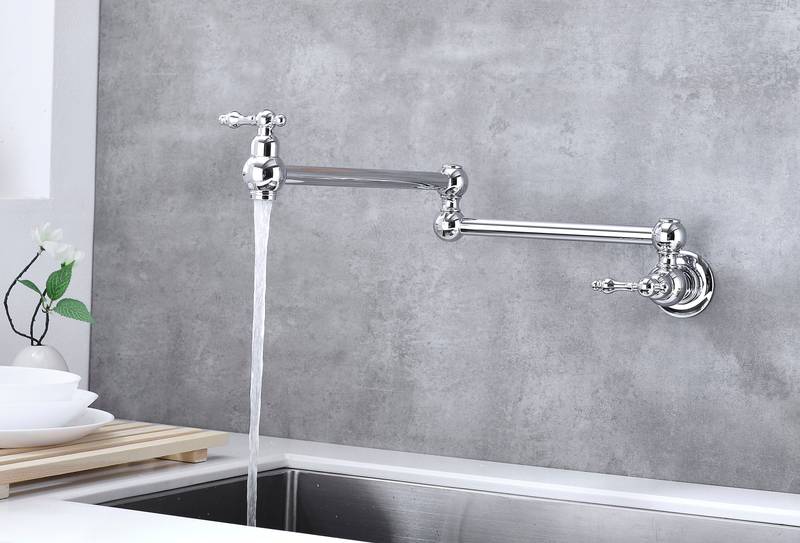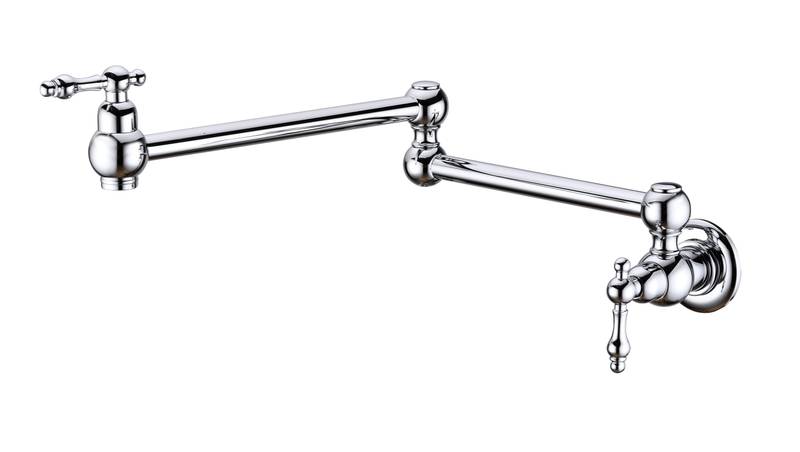 - Introducing our stylish Chrome Pot Filler Faucet, crafted from durable brass and designed for ultimate convenience in your kitchen. This pot filler features a free-swivel arm, allowing effortless pot filling and easy cleaning. With double handles, you can control water flow with precision, ensuring no drips. Plus, our special treatment helps resist corrosion and fingerprint marks, keeping your faucet looking pristine. Enjoy a smooth, quiet, splash-free water flow with our quality aerator. Elevate your cooking experience today!