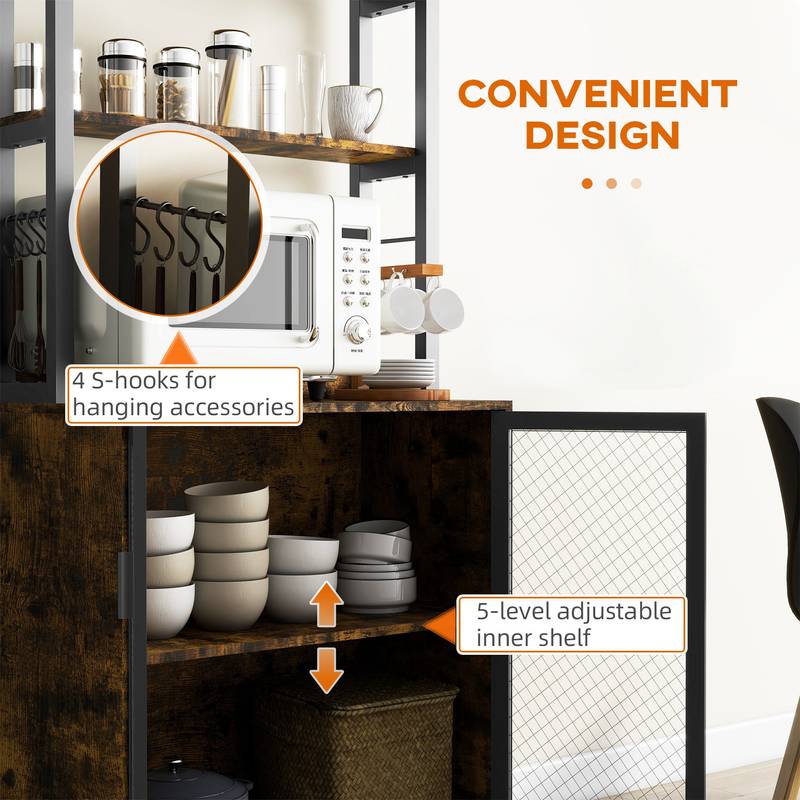 - Key features include multiple shelves with one adjustable for customizable storage, plus four S-shaped hooks for easy access to your kitchen essentials. Perfect for coffee enthusiasts, it offers a dedicated space for your coffee maker and accessories, making your morning routine a breeze.