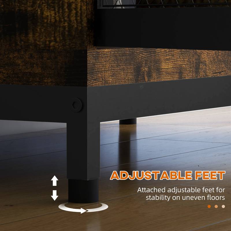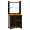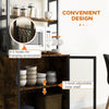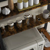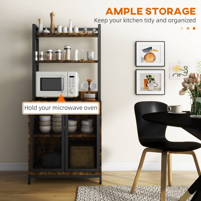 - Transform your kitchen with our stylish and functional baker's rack, designed to tackle clutter and enhance your space. Made from sturdy particle board and featuring a sleek black powder-coated steel frame, this rustic brown shelving unit is not just visually appealing but also practical.