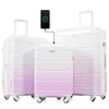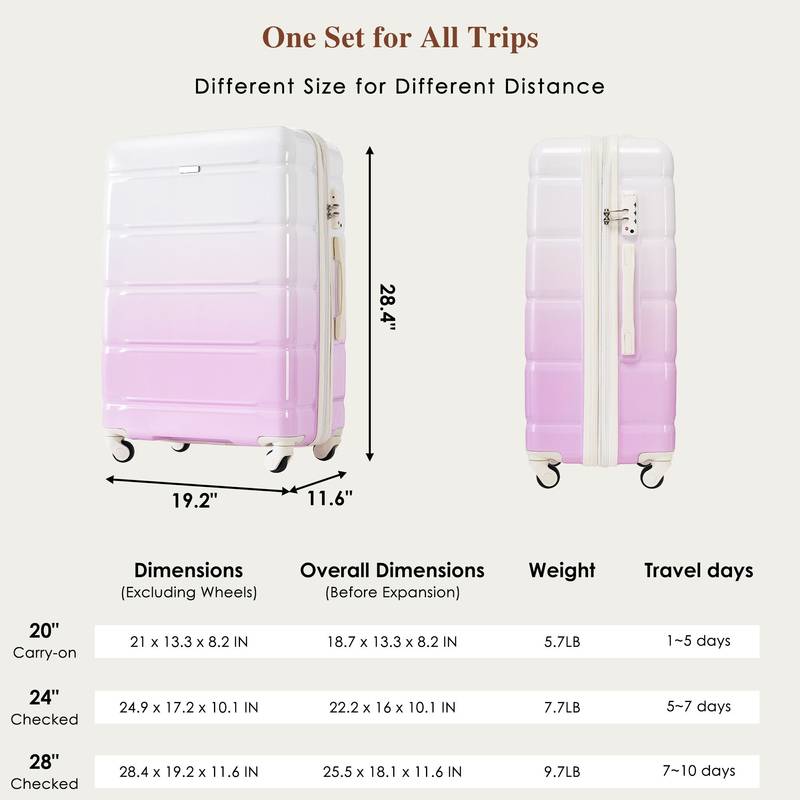 - Introducing our stylish Purple Luggage Set, expertly crafted from durable ABS+PC materials that combine lightweight design with robust durability. This 3-piece set includes a 20” carry-on with USB charging ports (power bank not included) and expandable 24” and 28” suitcases for up to 25% more packing capacity.