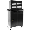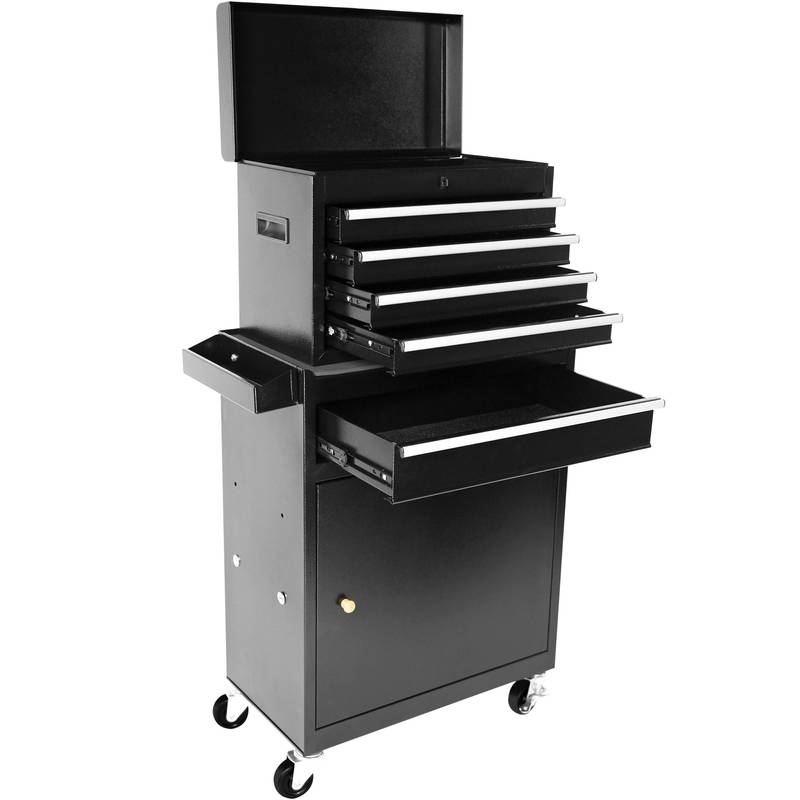 - This sleek black cabinet combines functionality with mobility, featuring a detachable 2-in-1 design. Use it as a 4-drawer tool box or a rolling tool cabinet, or store the top box inside the bottom cabinet to save space. With an impressive storage capacity, it includes a top tray, five drawers, and a spacious bottom cabinet with an adjustable shelf. Plus, you’ll find 8 removable hooks and 7 storage boxes to keep your tools easily accessible.
