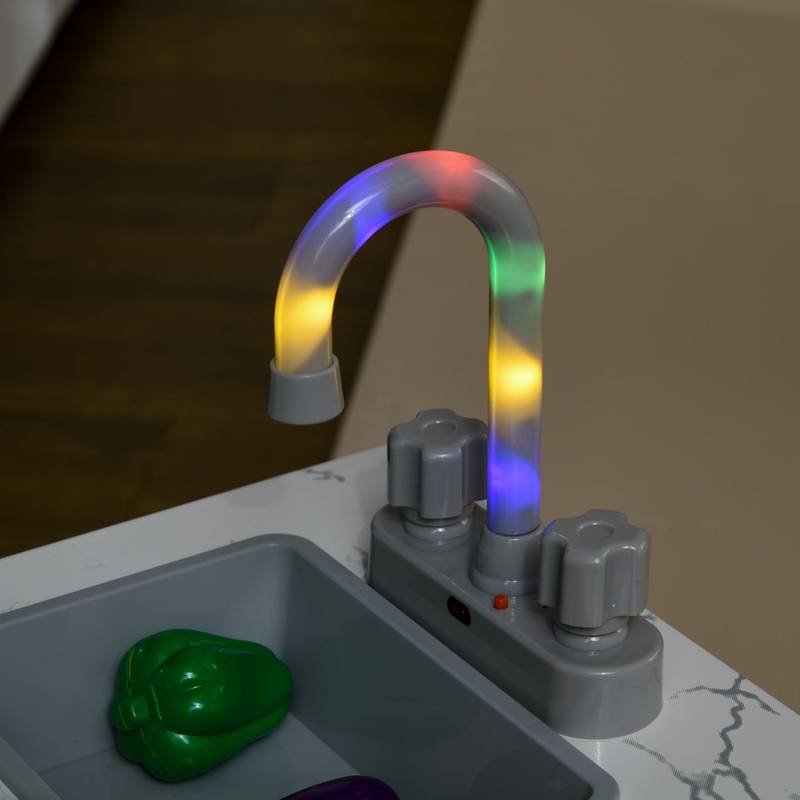 - Engage your child's imagination with exciting lights and sound effects from the range hood, microwave, and cooktop knobs, creating a realistic cooking experience. Your little chef can even wash the dishes in the molded sink after their culinary creations, promoting valuable habits.