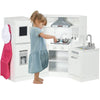 - Introducing the perfect addition to your child's playtime: our delightful toddler play kitchen! Designed in a sleek white polypropylene finish, this kitchen set measures 47.25" L x 23.5" W x 31.5" H, making it an ideal fit for kids aged 3-6 years.