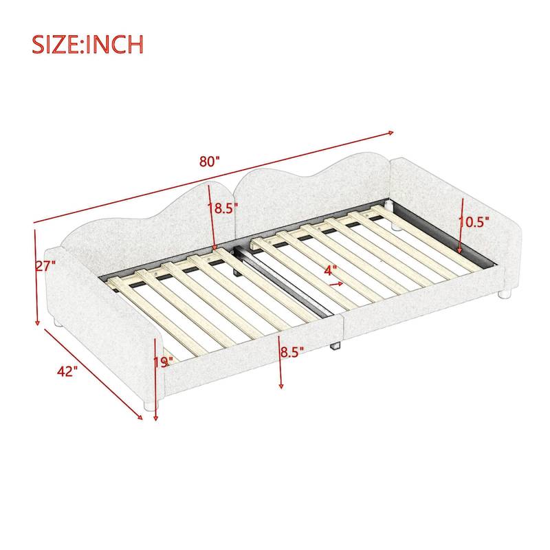 - Introducing the Twin Size Upholstered Daybed, a stylish and cozy addition to your home. Crafted from soft sherpa fabric, this daybed features an adorably elegant cloud-shaped backrest, making it a perfect fit for any decor and a favorite among kids.