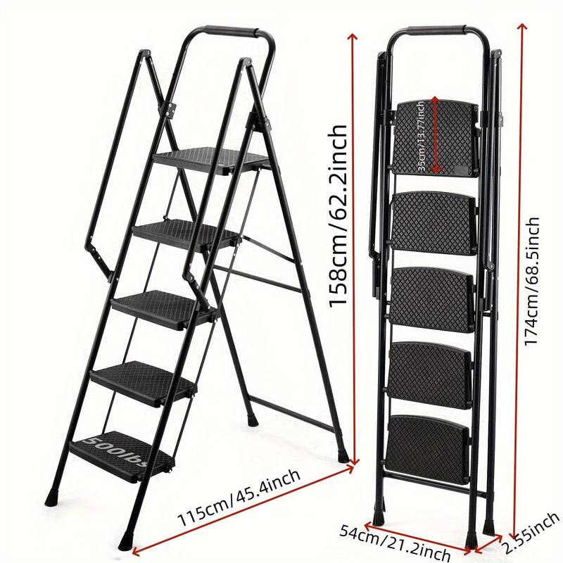 - Introducing our stylish and sturdy ergonomic ladder, designed for safety and convenience. With a sleek black finish, it measures 18.11 inches long, 35 inches wide, and 63.90 inches high, weighing just 19.84 lbs.