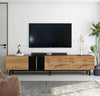 - Elevate your living space with our modern TV stand, designed to support TVs up to 80 inches. This sleek natural wood cabinet combines minimalist style with versatile functionality, making it a perfect match for various decor themes.