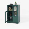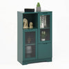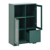 - Introducing our stylish and versatile storage cabinet, perfect for any space in your home or office. Made from high-quality MDF with a vibrant green finish, this cabinet features two elegant glass doors revealing adjustable shelves and two open compartments for all your storage needs.