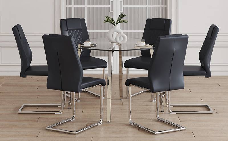 - Transform your dining experience with this stylish dining set that seats up to 6. Featuring a sleek circular tempered glass tabletop, it adds a modern touch to any space while offering durability and heat resistance for everyday use. The comfortable grid PU cushions on the chairs provide both aesthetic appeal and easy maintenance, perfectly complemented by sturdy silver metal legs.