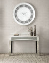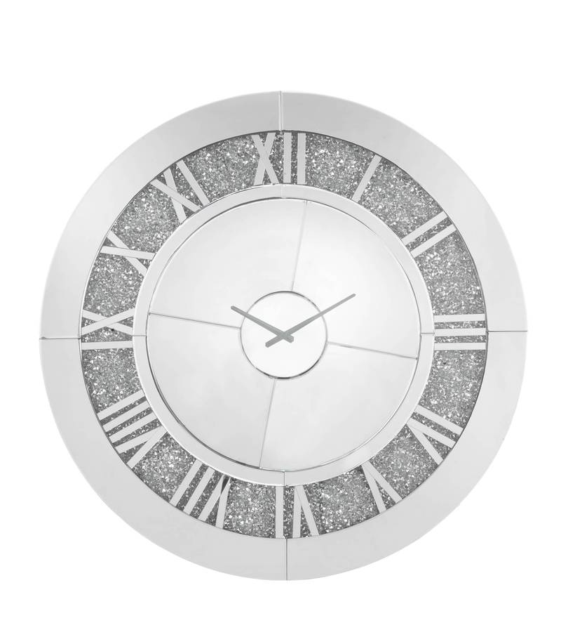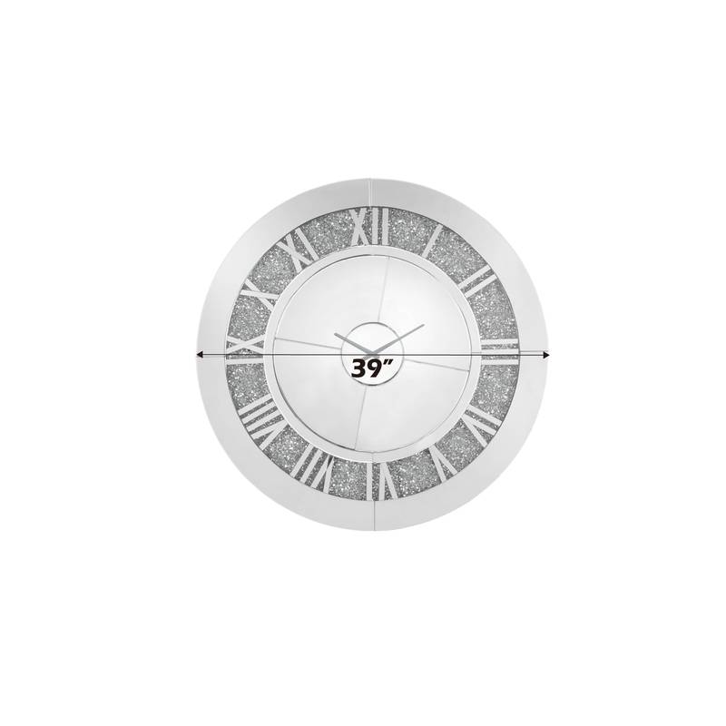 - Elevate your decor with the stunning Noralie round wall clock. Its 39-inch diameter features a glamorous design, highlighted by beveled mirrored panels and eye-catching faux diamonds. Made from durable engineered wood, this clock combines style and sturdiness, showcasing a classic roman numeral face for a timeless appeal.
