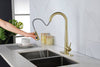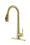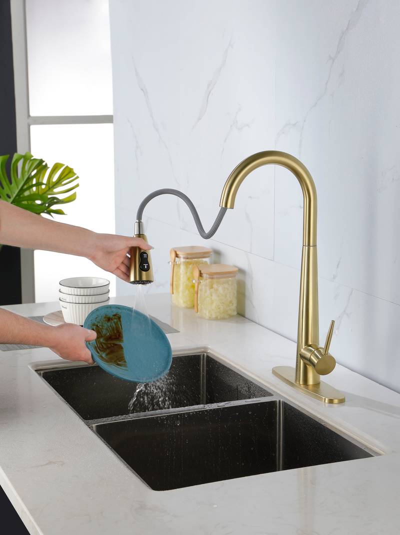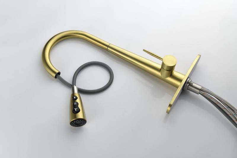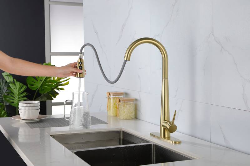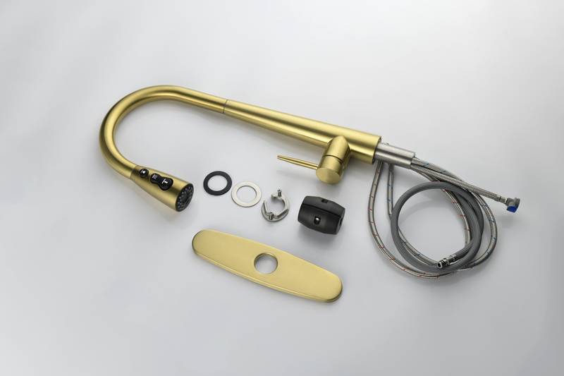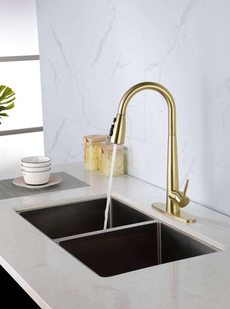- Transform your kitchen with our elegant Gold Stainless Steel High Arc Pull Out Kitchen Faucet. This stylish single-handle faucet pairs seamlessly with most sinks, adding a fresh touch to your space.