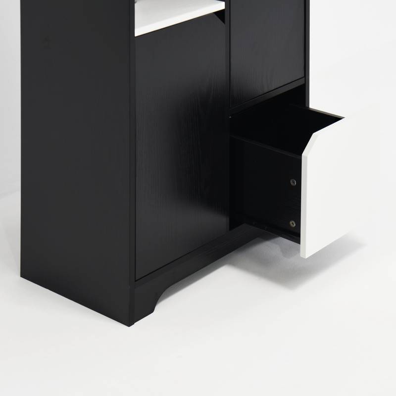 - Crafted from durable particle board and finished in classic black, this cabinet offers a generous storage capacity with dimensions of 23.62" W x 13.78" D x 63" H. It neatly organizes your kitchen essentials—whether it's food, utensils, or dishes—ensuring everything has its place.