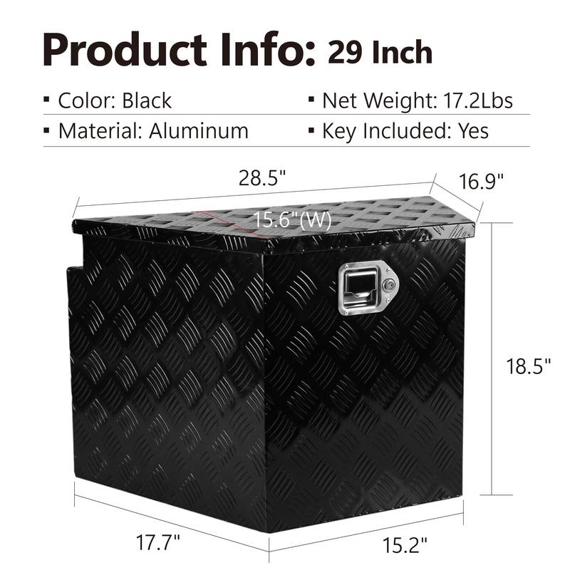 - Introducing our durable and lightweight Trailer Tongue Box, designed to keep your tools and gear organized and protected. Made from premium aluminum with a sleek black finish, this box boasts a spacious interior (28.5" x 17.7" x 18.5") that fits batteries, tools, and outdoor equipment without adding extra weight to your trailer.