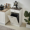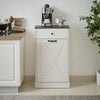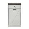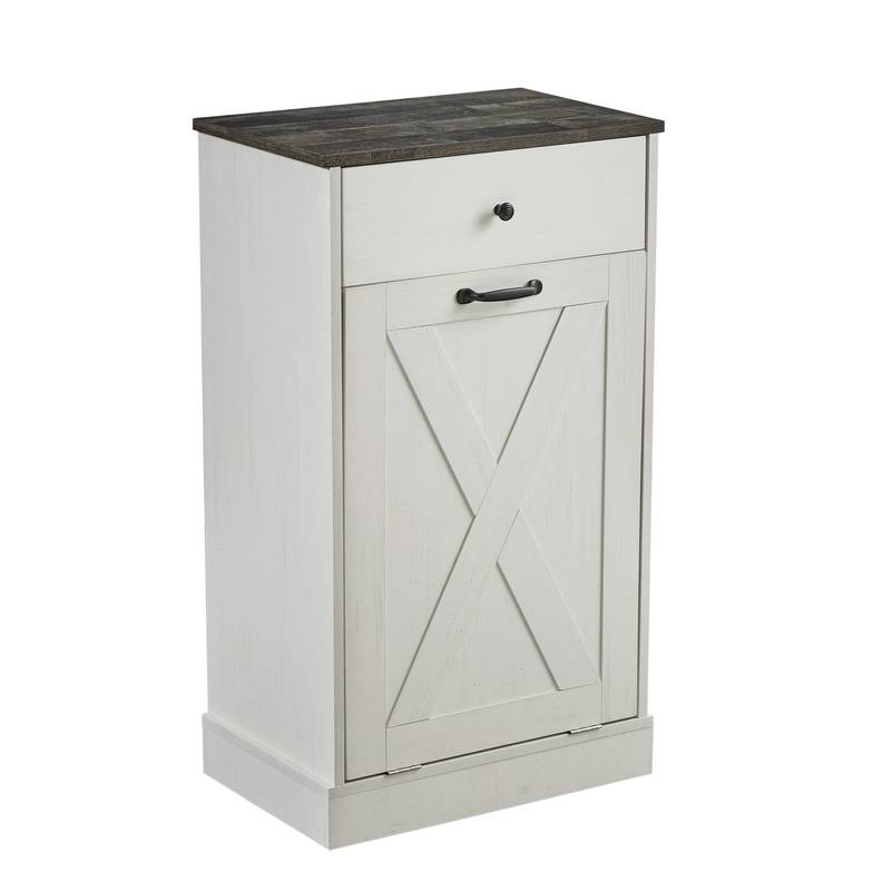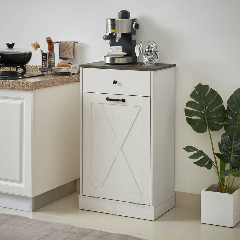 - Introducing our stylish white trash can cabinet, perfect for organizing your space while adding a touch of modern rustic charm. This freestanding cabinet cleverly conceals trash, kitchen waste, or other items, while its ample countertop space is ideal for displaying decor, plants, or small appliances. Crafted from durable chipboard, it features a polished finish and includes a drawer and a tilting holder for functionality and convenience. Suitable for any room – from the kitchen to the office – this versatile cabinet combines practicality with a sleek design to enhance your home.