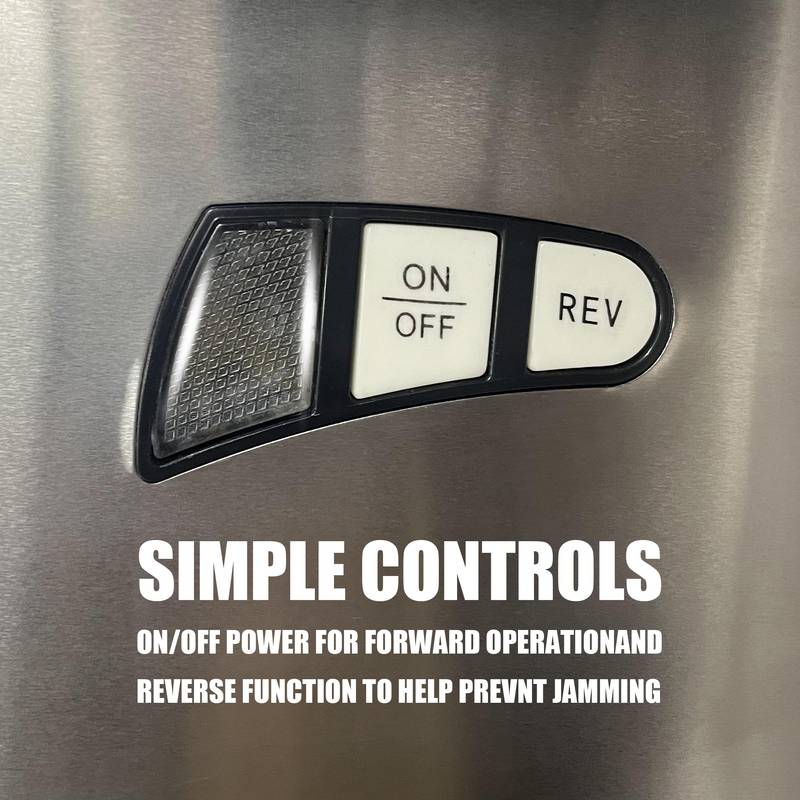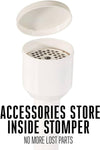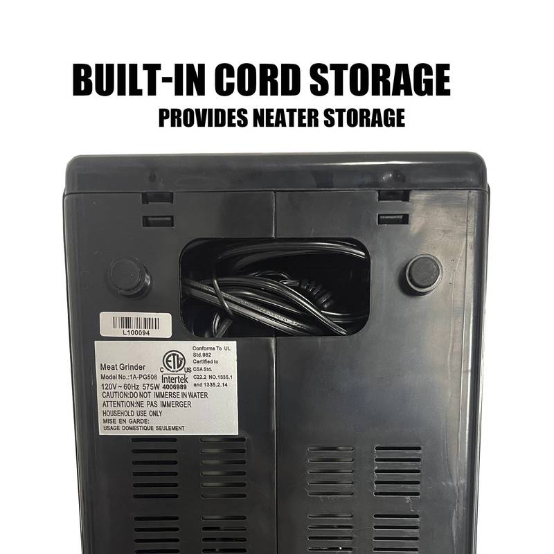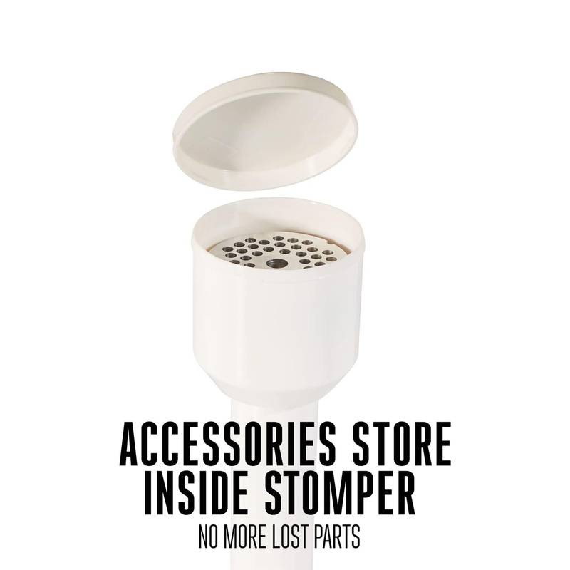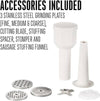 - Key features include three stainless steel grinding plates (fine, medium, and coarse) for customized meat texture, a cutting blade, and a sausage stuffing funnel. Plus, all accessories conveniently store in the stomper when not in use.