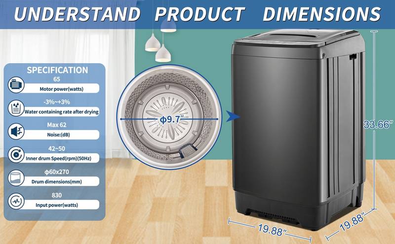 - With dimensions of 19.88" x 19.88" x 33.66" and a weight of just 41.89 lbs, this washer is easy to move and fit into tight quarters. It boasts a stainless steel drum with a generous 17.6 lbs capacity, ensuring you can tackle your laundry efficiently.