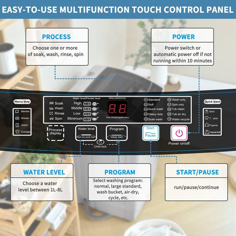 - Enjoy a multifunctional washing experience with 10 customizable programs, including standard, quick wash, and heavy-duty options. The user-friendly design features a transparent lid, adjustable feet, and a red LED digital display for seamless operation.