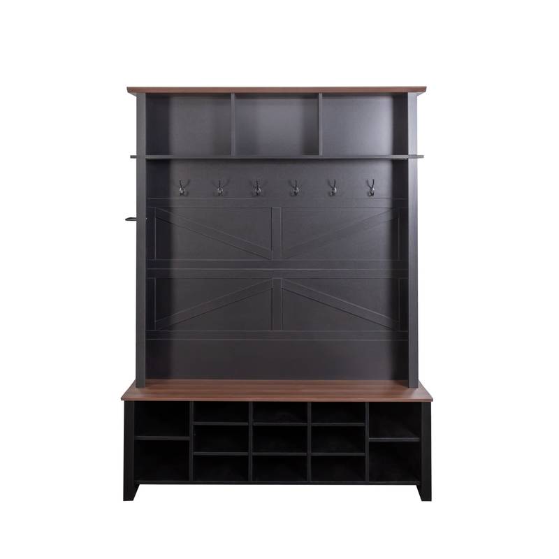 - Transform your entryway with this stylish Hall Tree, designed with a charming farmhouse retro flair. Its walnut-colored roof and X-shaped back panel add a rustic touch to your space, making it perfect for your living room, entryway, or mudroom.