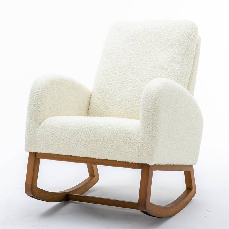 - Discover the perfect blend of style and comfort with our Mid-Century Modern Nursery Rocking Armchair. This inviting piece features a sturdy solid wood frame and plush teddy fabric upholstery, making it an ideal spot for reading or napping.