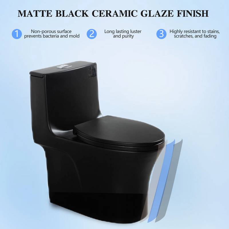 - Introducing our sleek One-Piece Elongated Toilet in a sophisticated matte black finish. Crafted from durable ceramic, this toilet combines modern aesthetics with functionality.