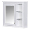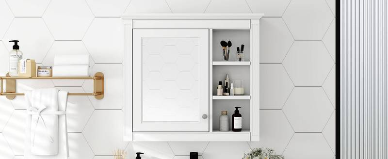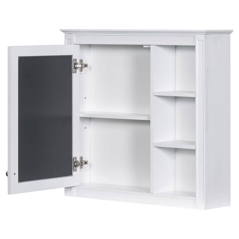 - Introducing our sleek wall-mounted medicine cabinet, the perfect blend of style and functionality for your bathroom. Crafted from high-quality MDF with a chic white finish, this cabinet comes with a mirrored door that not only enhances your space but also provides a practical grooming solution.