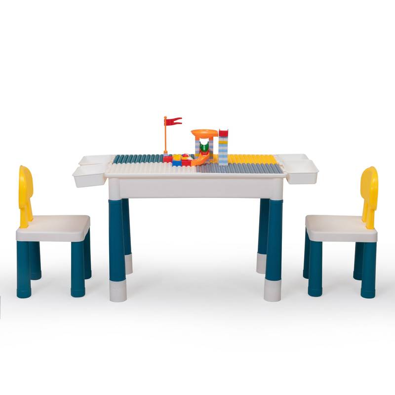 - The unique design features a sliding block board on one side, while the other serves as a sturdy tabletop. With an adjustable cushion option, the table height can be customized for comfort. The set comes with two stylish square chairs, each designed for fun and stability, and features non-slip cushions for added safety.
