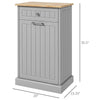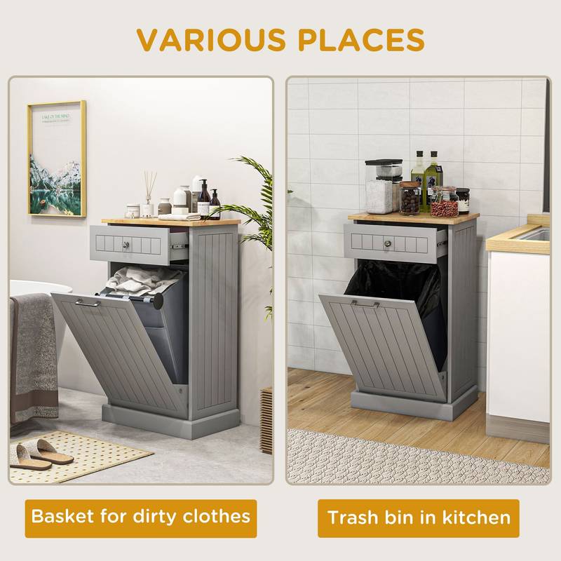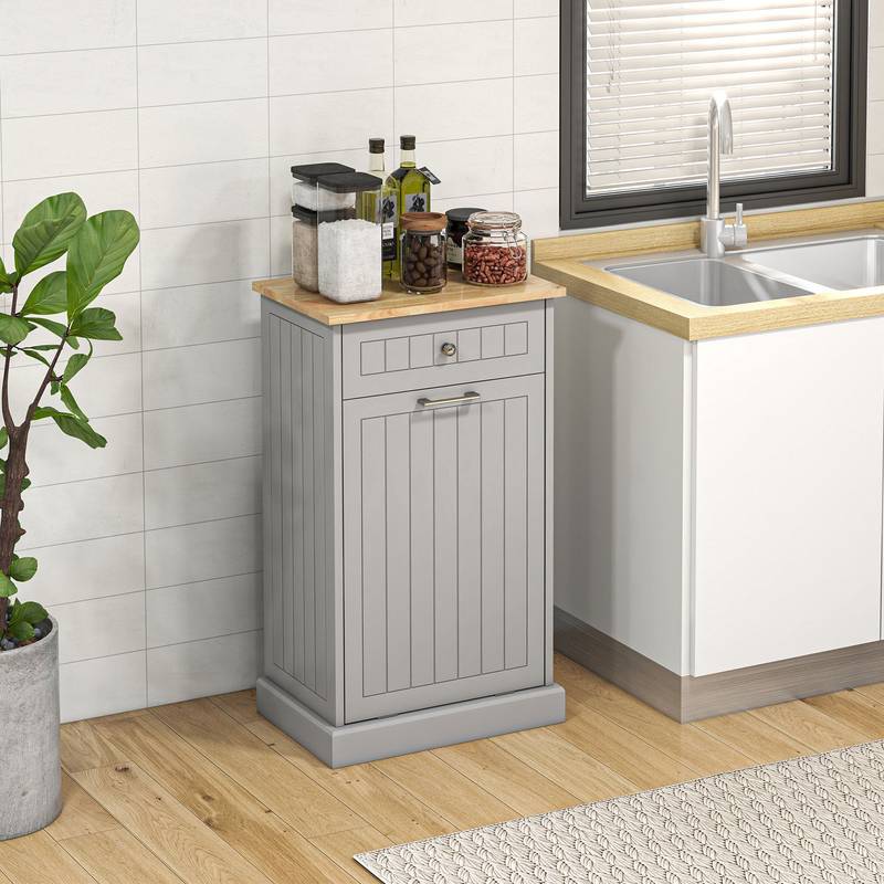 - Introducing our multifunctional kitchen trash cabinet in a sleek grey finish. Made from durable MDF, this stylish piece not only hides unsightly trash but can also double as a laundry hamper or storage for pet supplies. Its space-saving design includes a generous tilting door cabinet and a drawer, perfect for keeping your kitchen tidy while also providing a surface for your microwave or coffee machine. Safety is prioritized with an anti-tip attachment, ensuring stability for homes with children and pets. With dimensions of 20"W x 13.3"D x 35.5"H, this sturdy cabinet is built to last and enhances your kitchen's functionality.