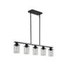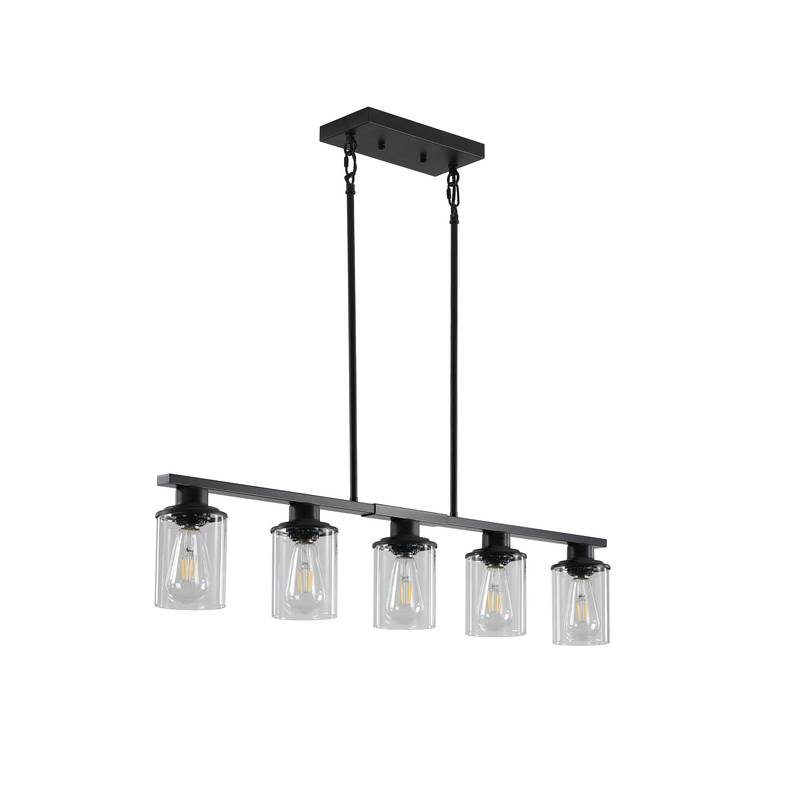 - Elevate your space with our Modern Industrial 5-Light Chandelier, a perfect blend of contemporary style and industrial charm. Crafted with a sleek black metal frame and clear glass shades, this chandelier effortlessly enhances any modern decor.