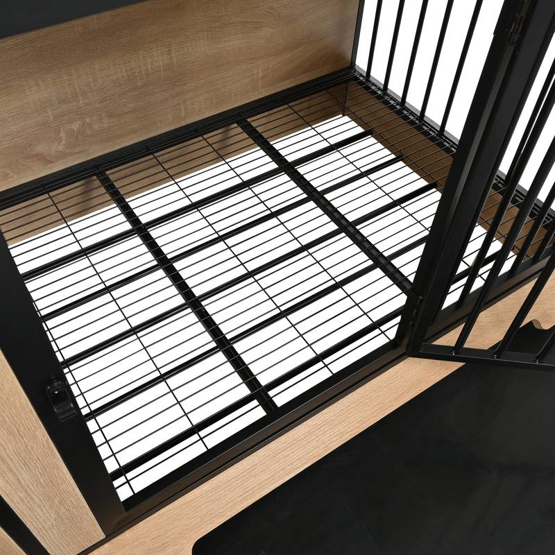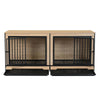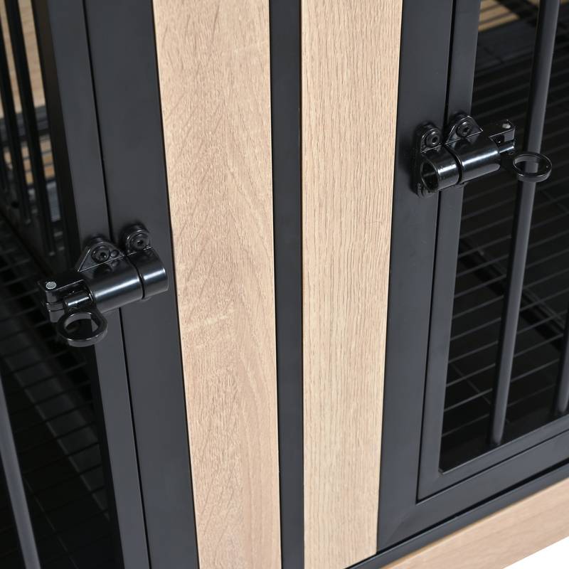 - Introducing the ultimate dog kennel designed for comfort and style! This spacious crate accommodates two large dogs, ensuring they have enough room to relax without feeling cramped. Crafted from durable MDF and sturdy iron, it features a sleek black and natural finish that fits seamlessly into any home decor.