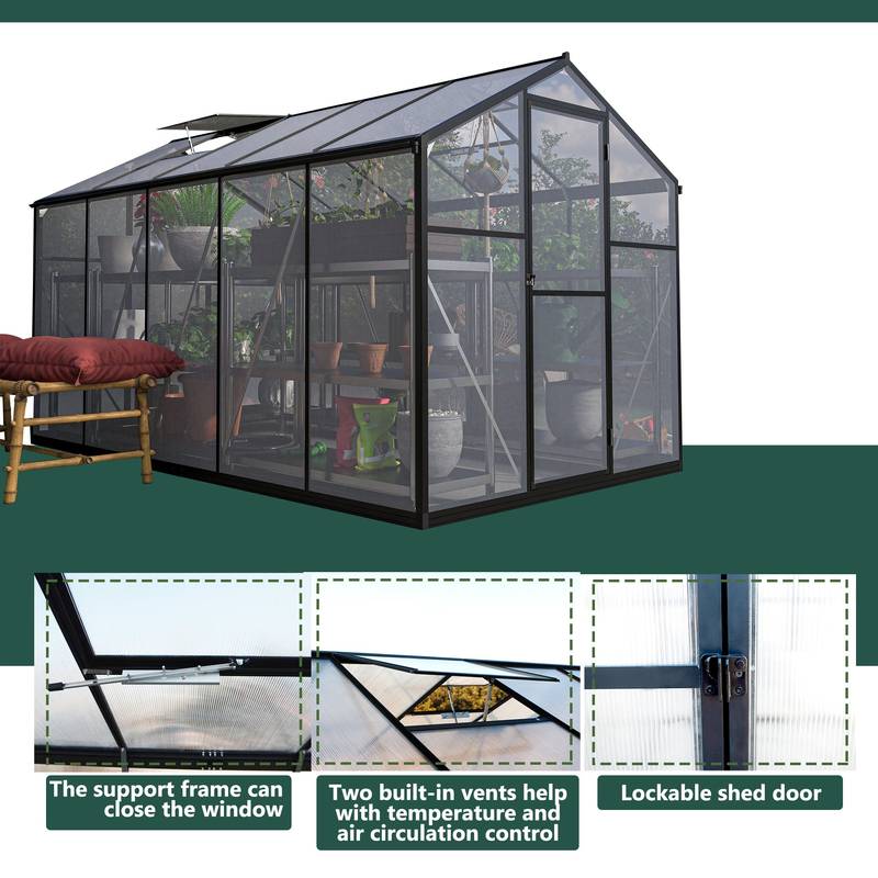 - For added security, our greenhouse features a lockable door, 2 temperature-regulating windows, and 4 drainage ports for easy water management. The rust-resistant aluminum frame ensures durability through any weather, including severe conditions.
