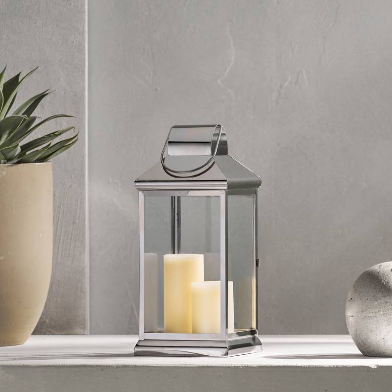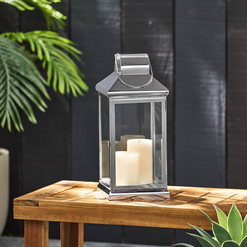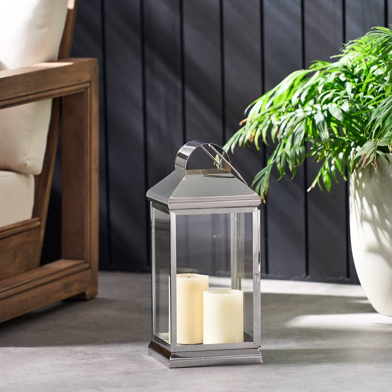 - Elevate your outdoor ambiance with our stylish silver lantern, designed for both beauty and durability. Made from rust-resistant stainless steel, it boasts a modern, tapered silhouette topped with a curved cap and a convenient wire handle for easy hanging. The polished finish adds a sleek touch, while tempered glass panels provide a stunning translucent look that’s resistant to breakage. Perfect for illuminating your patio or backyard, this lantern seamlessly blends elegance and functionality, bringing a warm glow to your gatherings.