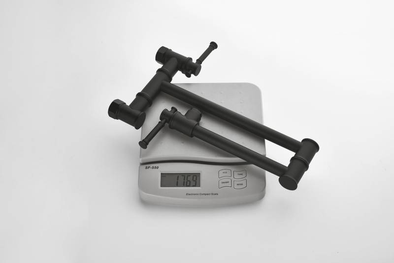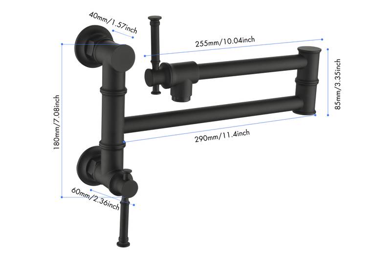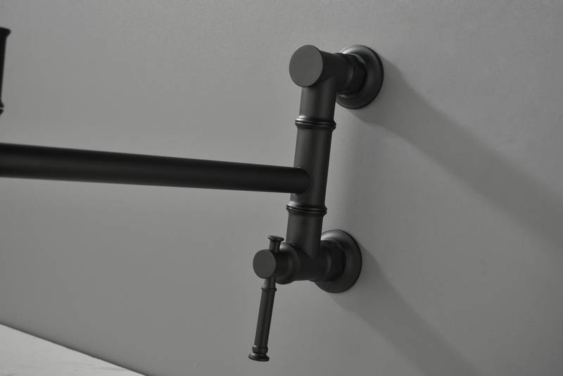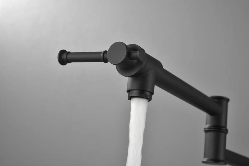 - Introducing our sleek Matte Black pot filler faucet, expertly crafted from durable brass. With a convenient free-swivel arm, this faucet makes filling pots on the stovetop a breeze while simplifying cleaning. The double handles ensure precise water control and eliminate drips. Plus, our specially treated surface resists corrosion and fingerprints, maintaining its stylish appearance. Enjoy a quiet, splash-free water flow thanks to the high-quality aerator. Elevate your kitchen with this functional and elegant addition.