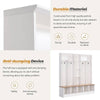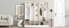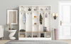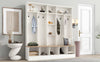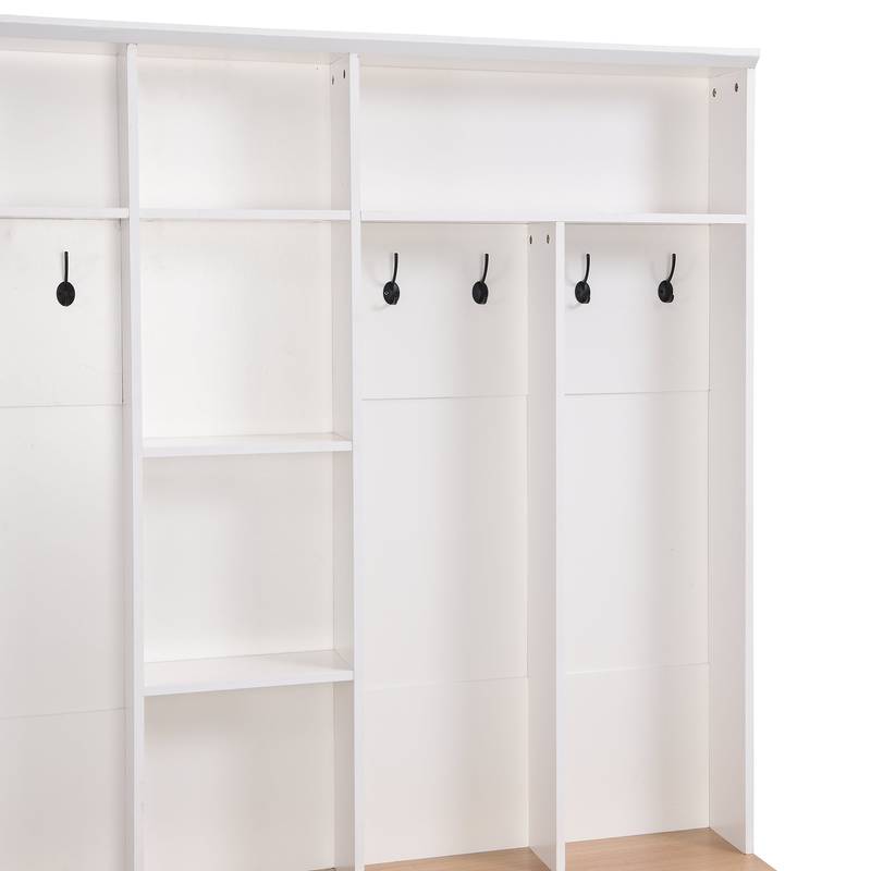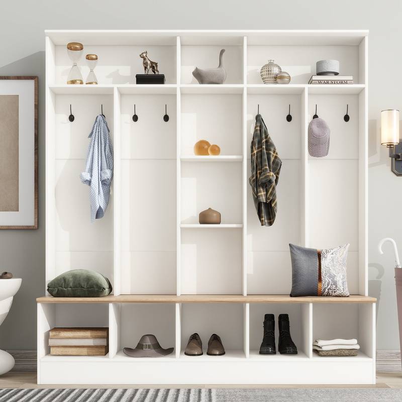- With a sleek white design and a warm wood-grain finish, it seamlessly complements any decor while keeping your space organized. This versatile unit features a coat rack, shoe storage bench, shoe rack, and display shelf—all in one. The spacious storage includes five large cubes and various open shelves, along with eight hooks to hang your coats, hats, and bags, minimizing clutter.