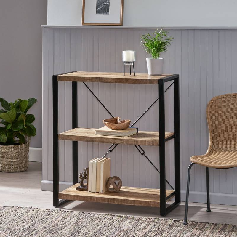 - Elevate your home decor with our Wooden and Iron 3-Shelf Rack, crafted in India. This stylish shelving unit combines a sleek powder-coated frame with natural mango wood shelves, creating a modern industrial look that suits any space.