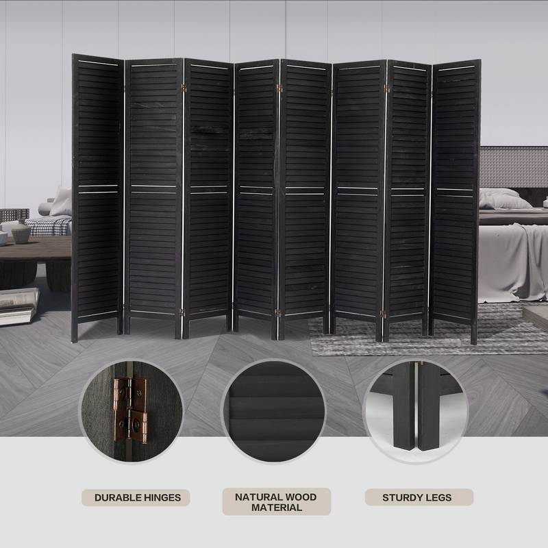 - Introducing our stylish and functional 8-panel room divider, crafted from durable paulownia wood with a sleek black finish. This rustic addition not only enhances your decor but also stands the test of time with its moisture-resistant and wear-resistant properties.