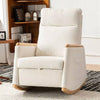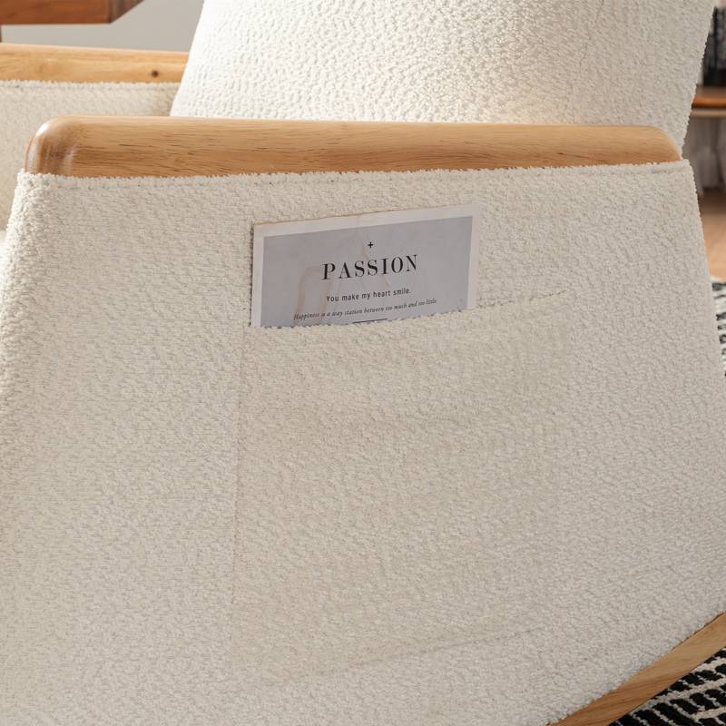 - Introducing our Beige Upholstered Rocking Chair, a perfect blend of style and comfort for any room in your home. Built with a solid wood base, this chair features a thick cushioned seat and back for an incredibly soft seating experience that helps relieve fatigue. With generous dimensions of 26.80” length, 38.60” width, and 40.60” height, it fits beautifully in your living room, bedroom, or nursery. Plus, its high backrest and cozy armrests provide excellent support for your body. The handy side storage pocket adds to its practicality, making it a must-have for anyone seeking relaxation and style.