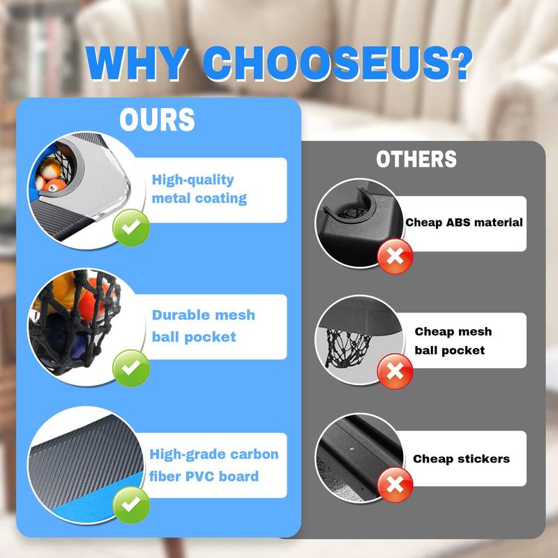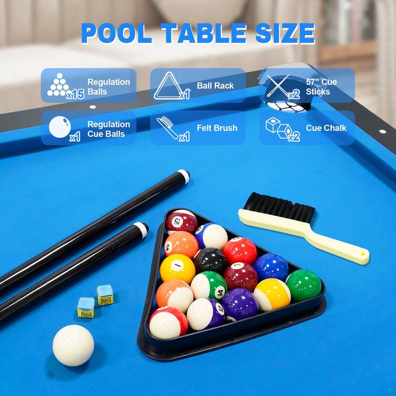 - Discover the perfect indoor addition for family fun with our sleek black and blue pool table! Crafted from sturdy MDF with painted steel legs, it promises strong structural stability and prevents sliding during play.