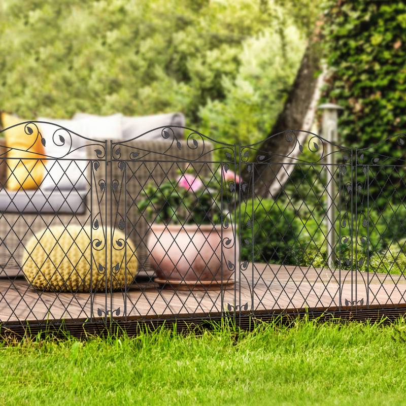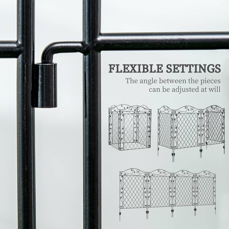 - Introducing our stylish Decorative Garden Fence, an ideal way to enhance your outdoor space. Made from durable steel and finished in a sleek black color, it combines functionality with charm. Each set includes four panels, measuring 34.75" x 43.25" high, and can be configured into various shapes like "I", "L", or waves to fit your needs.