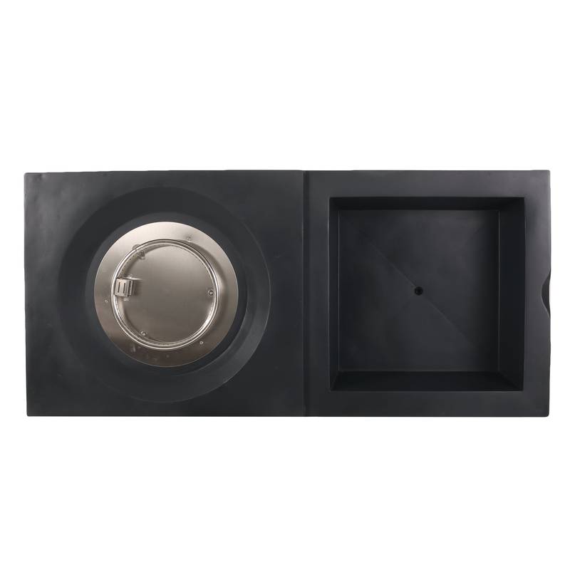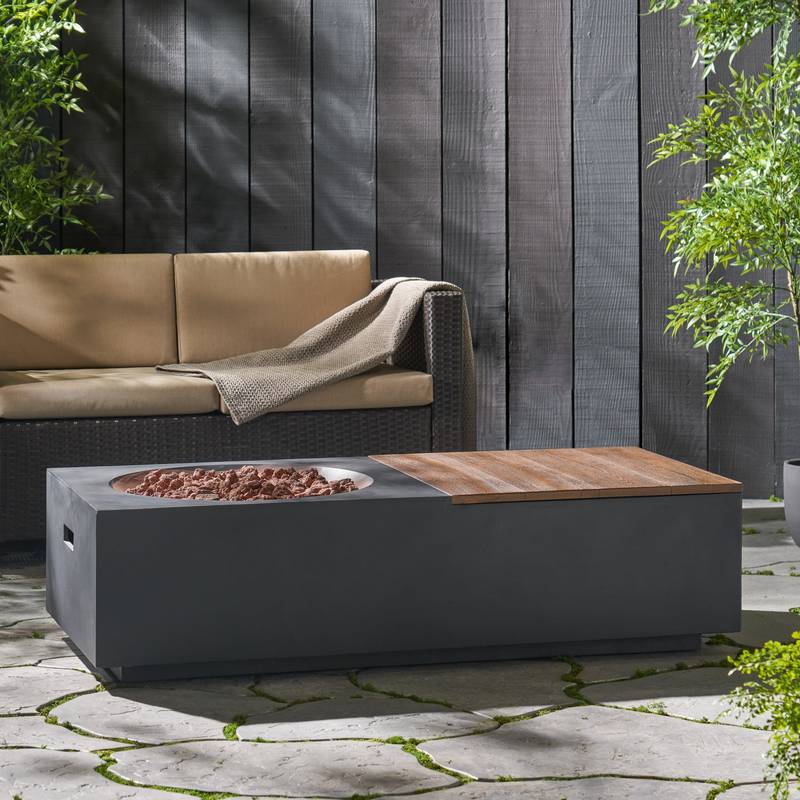 - Introducing our stylish fire pit table, perfect for enhancing your garden and outdoor spaces. Crafted from durable lightweight concrete, this fire pit combines a modern dark gray finish with a natural wood look, making it a stunning addition to your patio.