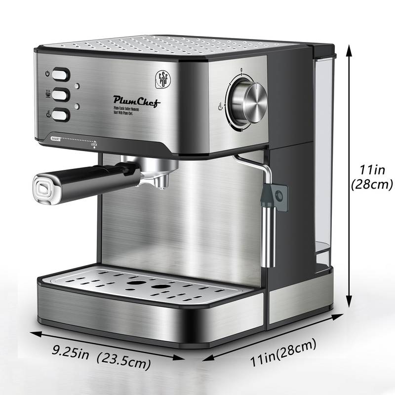 - Introducing our stylish and durable stainless steel espresso machine, designed to elevate your coffee experience at home. With a sleek silver finish, this machine measures 9.25 inches in length, 10.63 inches in width, and 11.22 inches in height, weighing 8.16 pounds, making it a compact yet powerful addition to your kitchen.