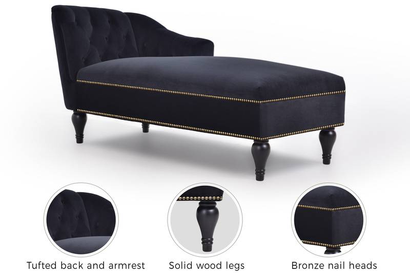 - Introducing the ultimate blend of comfort and style: our chic velvet chaise lounge. Originating from Vietnam, this inviting piece features plush fabric and a sleek black finish, designed to fit perfectly in cozy spaces like bedrooms or small living rooms.