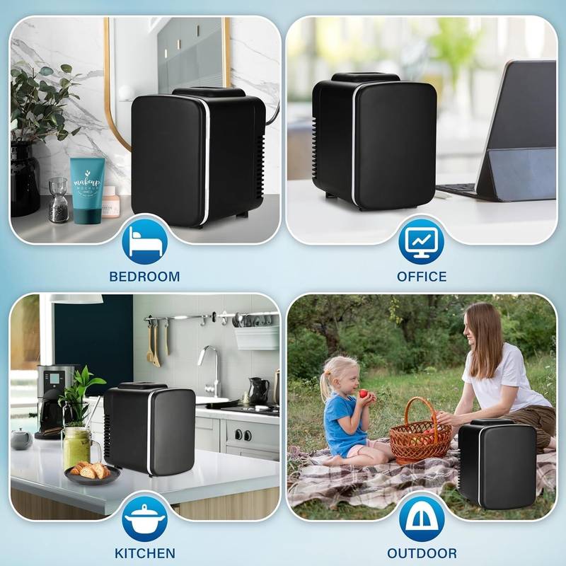 - Introducing our stylish black mini fridge, perfect for every occasion! With a compact 4-liter capacity, it can hold up to six 12 oz cans, making it ideal for bedrooms, offices, dorms, and camping trips. Its versatile design allows you to easily switch between cooling and warming, keeping your food, drinks, and even cosmetics at the perfect temperature (as low as 34°F and as high as 131°F).