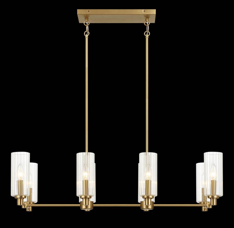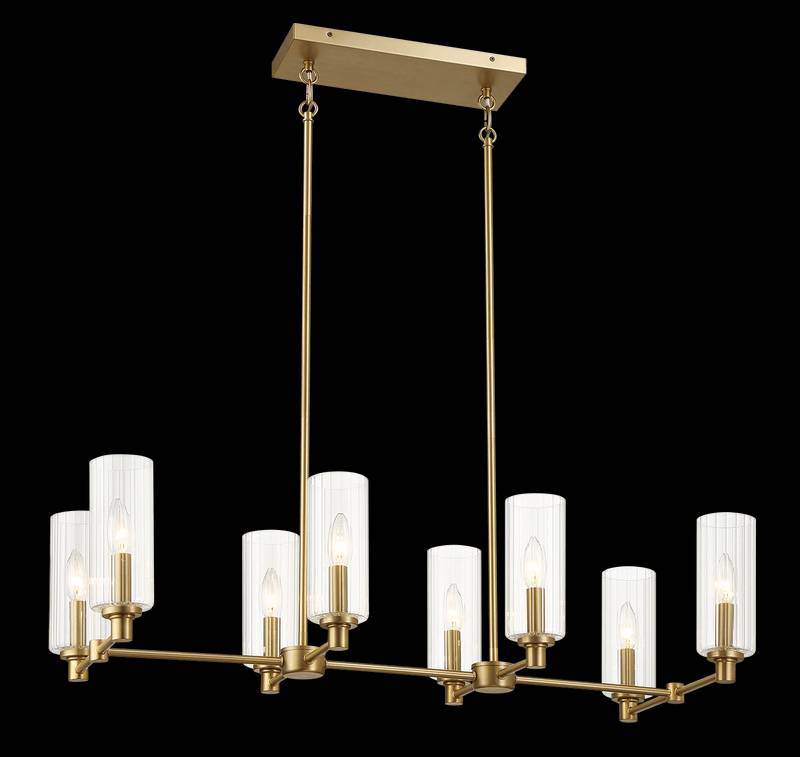 - Introducing the Willow Eight Lights Island, a stunning ceiling light that effortlessly enhances any kitchen with its elegant design. Crafted with clear ribbed glass and a satin brass finish, this fixture radiates warmth and sophistication. Spanning 36 inches in length and illuminating your space with eight lights, it creates a beautiful ambiance perfect for gatherings and everyday moments. Elevate your home decor with this opulent yet inviting piece.