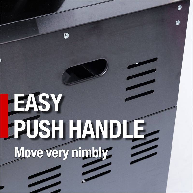 - Designed for convenience, the grill features a temperature gauge, halogen cooking lights, and an easy-access grease tray for hassle-free cleaning. The sleek black granite countertops add a modern touch, while gliding castor wheels ensure effortless mobility.