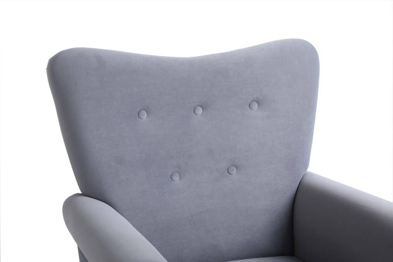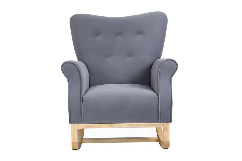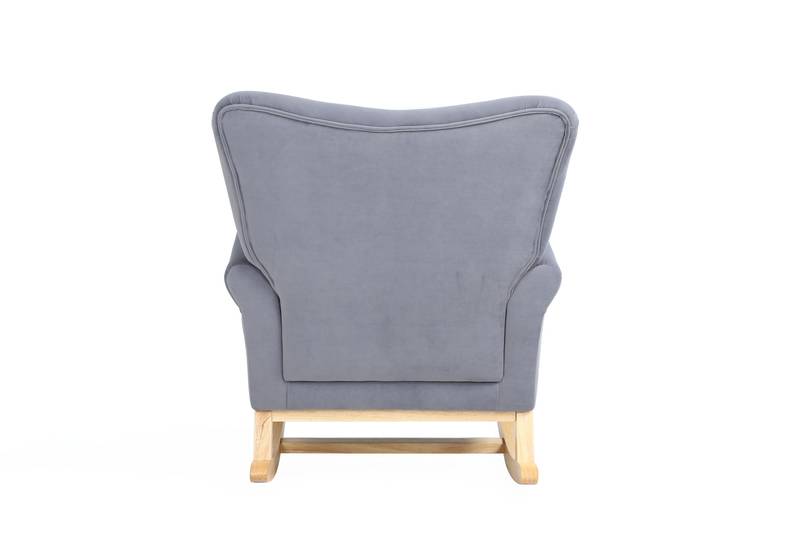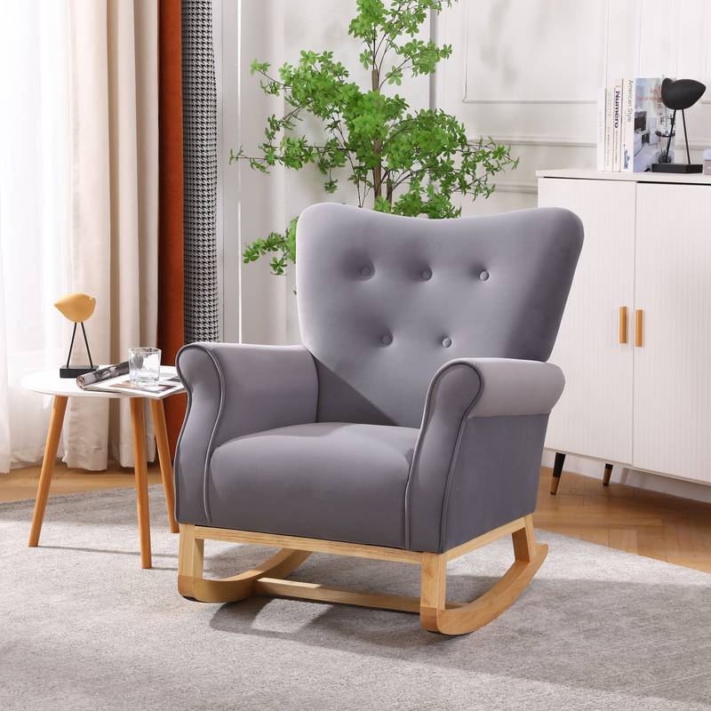 - Elevate your space with this stylish and versatile nursery rocking chair, perfect for soothing your little one or creating a cozy reading nook. Crafted from elegant grey velvet with a warm wood finish, its chic design complements any decor.