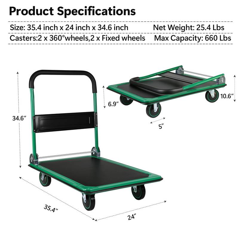 - Introducing our green steel platform push cart—your go-to solution for transporting heavy loads effortlessly. With a robust capacity of 660 lbs, this sturdy yet lightweight cart (weighing only 25.35 lbs) is engineered for strength and durability.