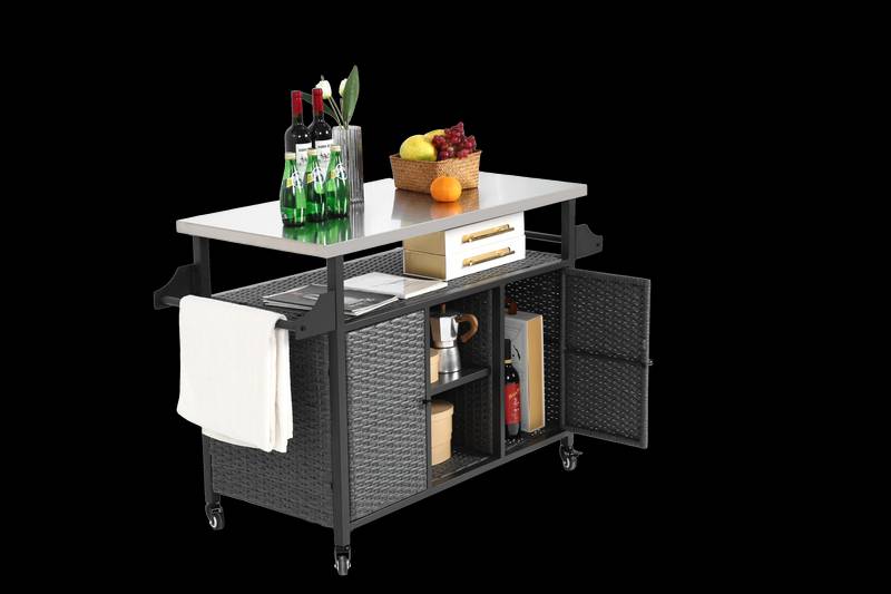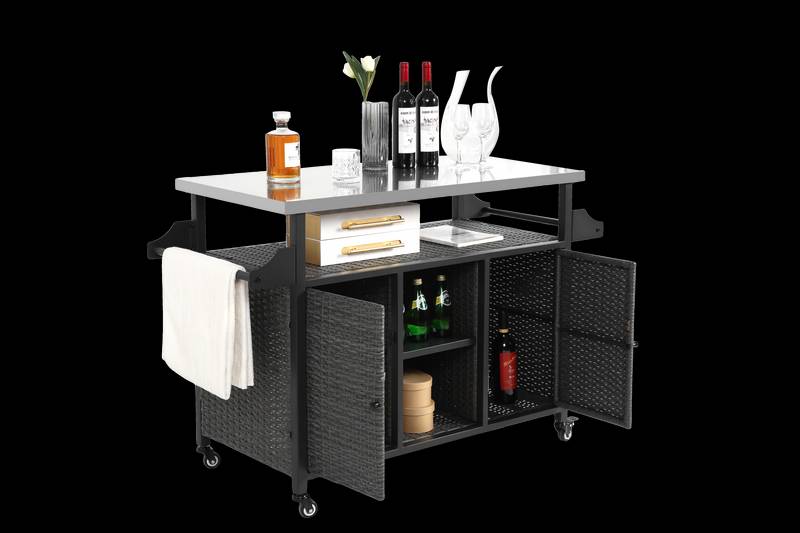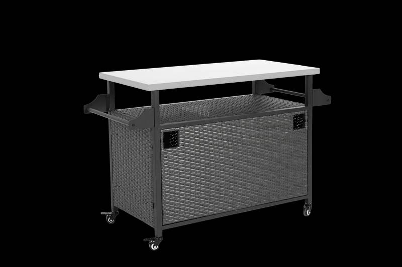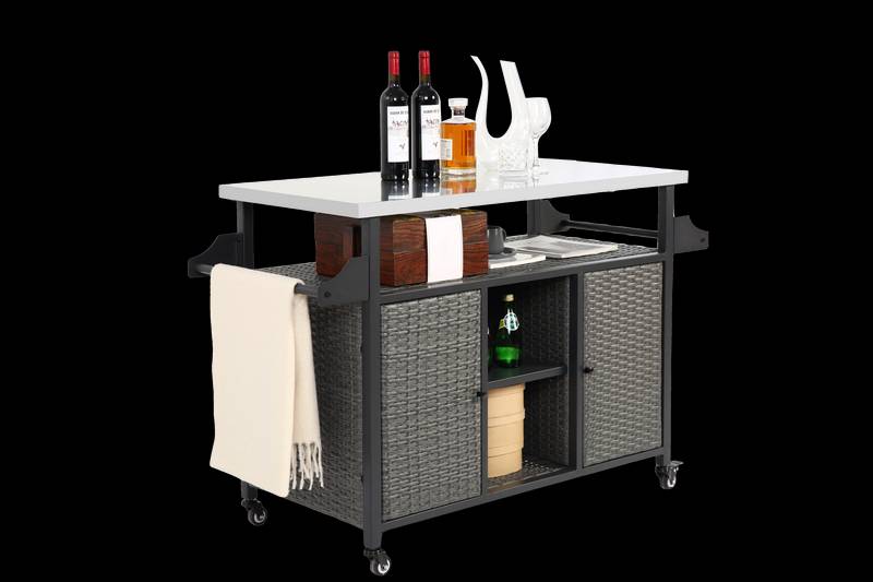 - Introducing our Large Outdoor Wicker Bar Cart – the perfect blend of style and functionality for your outdoor space! Crafted from sturdy steel with a sleek grey finish, this rolling cart is designed for versatile use in gardens, yards, pools, kitchens, and dining areas.