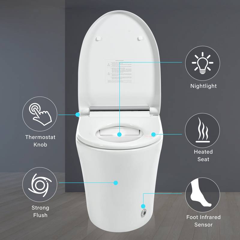 - - Intelligent Flushing: Save water with a dual flush system, offering both foot-activated and knob controls for ultimate hygiene and ease of use.