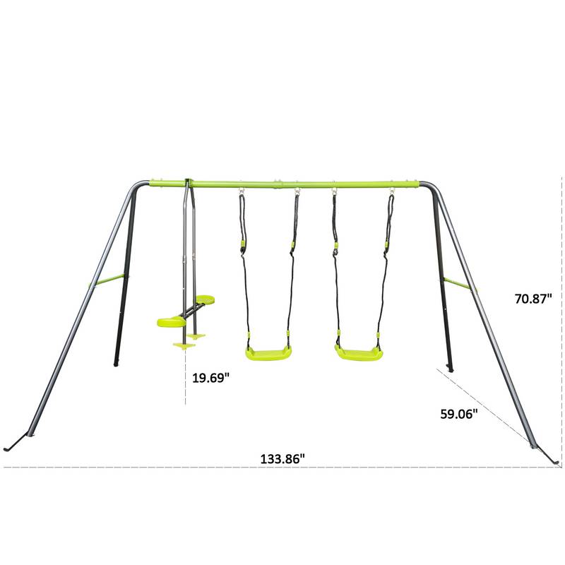 - Introducing our vibrant metal saucer swingset, perfect for kids ages three and up! With a spacious design measuring 133.86 inches long, 59.06 inches wide, and 70.87 inches high, it invites up to four children to swing and play together. The sleek lime green and black finish adds a modern flair to any backyard.