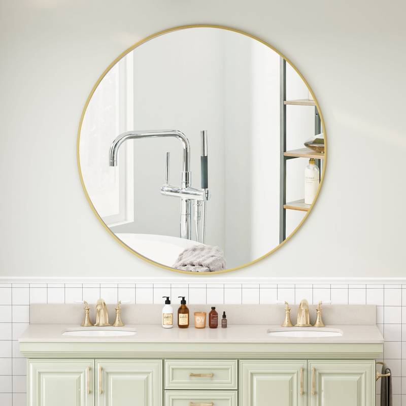 - Elevate your space with this stunning 42" Wall Mounted Gold Circular Mirror. Crafted with a sleek metal frame, its contemporary design features smooth lines and a luxurious golden finish that fits seamlessly into any room – be it your bathroom, bedroom, or living room.
