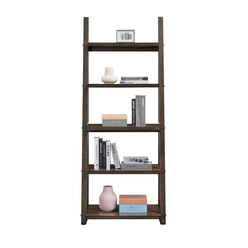 - Upgrade your space with our stylish 5-Tier Ladder Shelf in a rustic brown finish. Crafted from solid rubber wood and MDF, this sturdy shelving unit combines durability with a sleek, modern design that fits effortlessly into any room – be it your living room, office, kitchen, or bedroom.